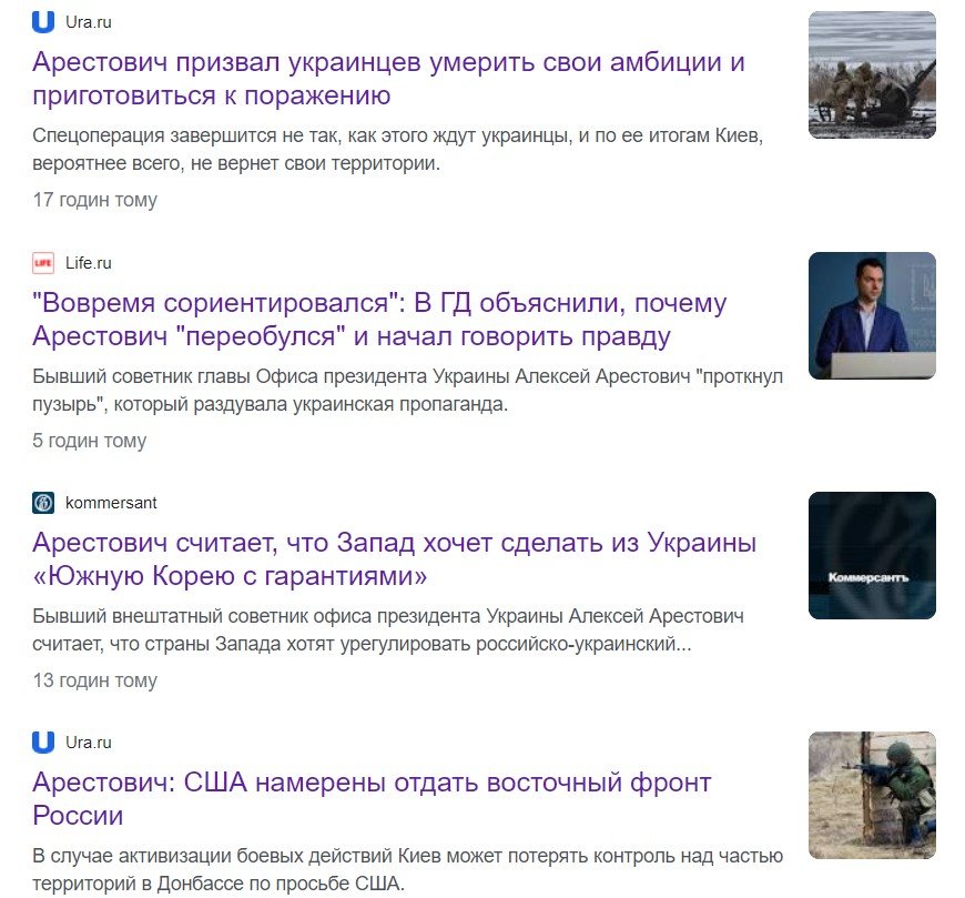 Словами Арестовича справді поспішила скористатися російська пропаганда. Ось лише кілька прикладів свіжих заголовків з російських ЗМІ, в матеріалах яких наводять цитати колишнього радника ОП: