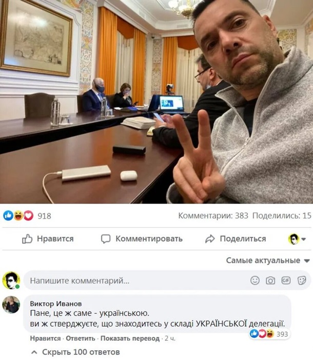 Як писав Український Дощ, у своєму пості Арестович, який крім того, що відповідає за комунікацію в ТКГ, ще і є радником глави Офісу президента, розповідав, наскільки важливо вміти вести переговори, проте, коли його попросили використовувати державну мову, він продемонстрував такий приклад спілкування:
