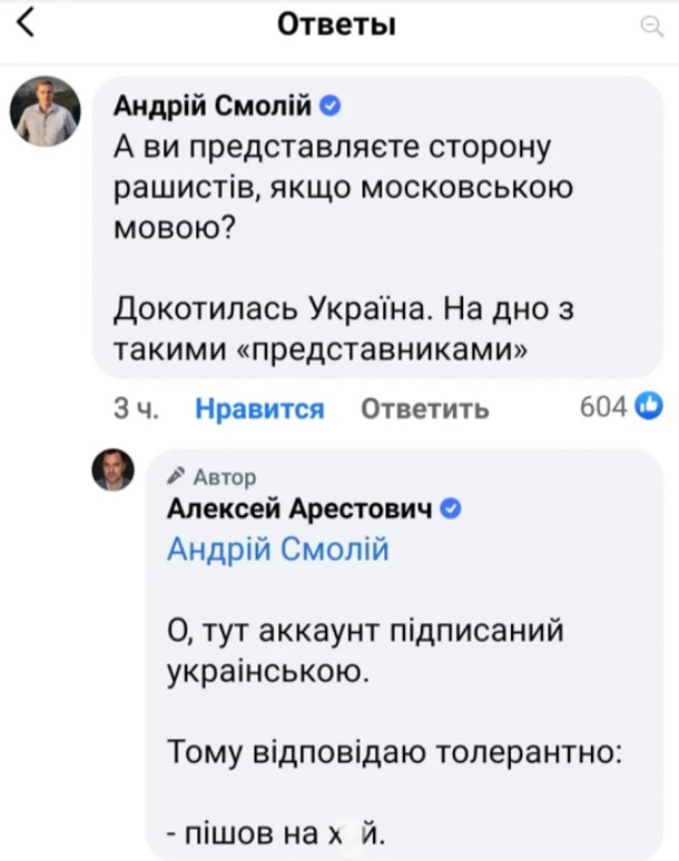 У коментарях до нового поста Арестовича користувачі надіслали скриншот спілкування спікера ТКГ з політологом Андрієм Смолієм, якого спікер теж послав "на х*й", але українською.