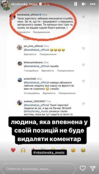 "Твою зарплату забирає виконавча служба, недотепо, за те, що ти — рецидивіст із порушень авторського права. Ти напиши пост про те, чому не віддав судові борги раніше", — написав продюсер у коментарі на сторінці співака, але потім видалив його.