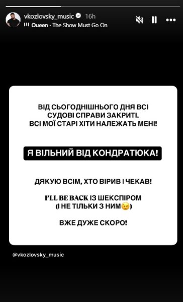 "Від сьогоднішнього дня всі судові справи закриті. Всі мої старі хіти належать мені. Я вільний від Кондратюка! Дякую всім, хто вірив і чекав. I'll be back з Шекспіром (і не тільки з ним). Вже дуже скоро!" — йдеться в тексті.