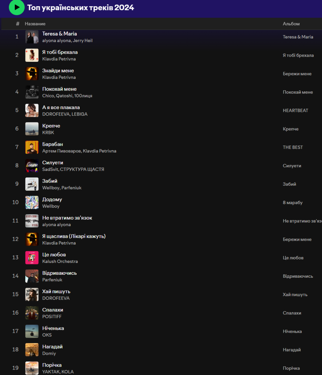 Перше місце серед композицій посів хіт "Teresa & Maria", створений у дуеті Alyona Alyona та Jerry Heil, які цього року представляли Україну на конкурсі "Євробачення". Слідом за ним ідуть одразу два треки Klavdia Petrivna: "Я тобі брехала" та "Знайди мене", що підтвердило її лідерство в музичних чартах.