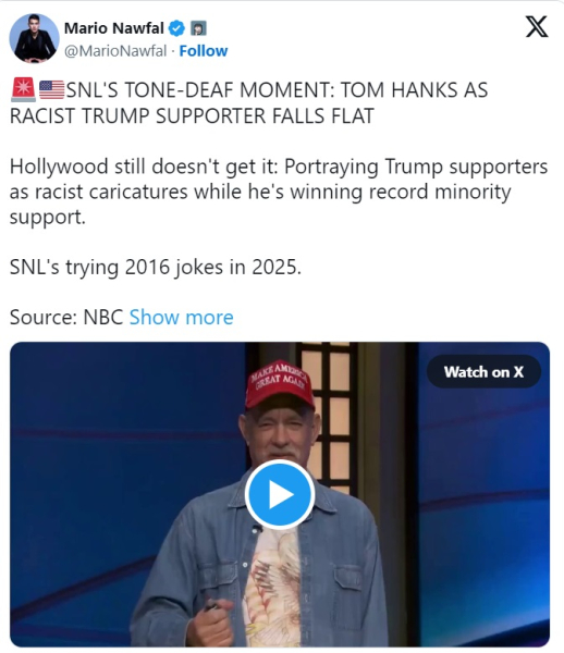 "Голлівуд усе ще не розуміє: зображати прихильників Трампа як расистські карикатури, тоді як він отримує рекордну підтримку меншості. SNL намагається жартувати про 2016 рік у 2025 році".