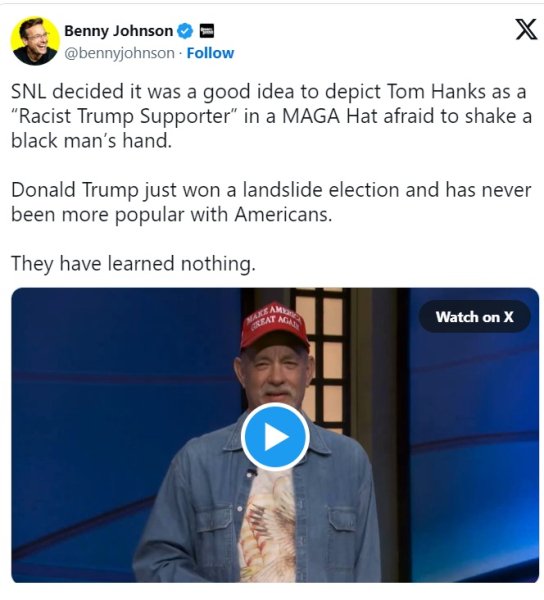 "Том Генкс щойно з'явився на SNL у кепці MAGA, де він поводився так, ніби не хотів тиснути руку чорношкірому. Це шоу дивується, чому їхні рейтинги в канавах. Трамп переміг за кількістю голосів виборців. Цей побитий штамп про те, що MAGA — расист, огидний. SNL — несмішне шоу для снобістських ліберальних еліт. Нинішня Республіканська партія — це велика коаліція, скомпрометована багатьма колишніми демократами. Скатертиною дорога, SNL!" — обурюється він.