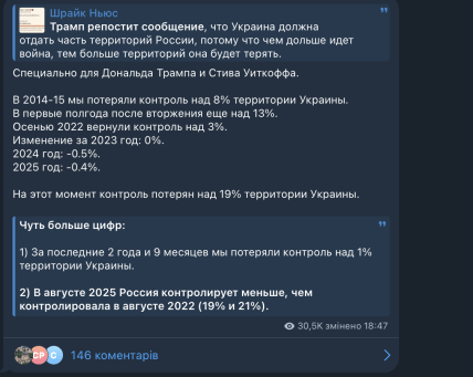 "У серпні 2025 року росія контролює менше, ніж контролювала в серпні 2022 року (19% і 21%)" - - написав Шрайк