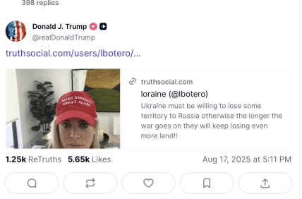 Президент США Дональд Трамп у своїй соцмережі Truth Social перепостив повідомлення, де стверджується, що Україна "має погодитися на втрату частини територій". Перед цим на телеканалі Fox News сенатор Марко Рубіо заперечив припущення, що лідер США нібито підтримує ідею передачі територій.